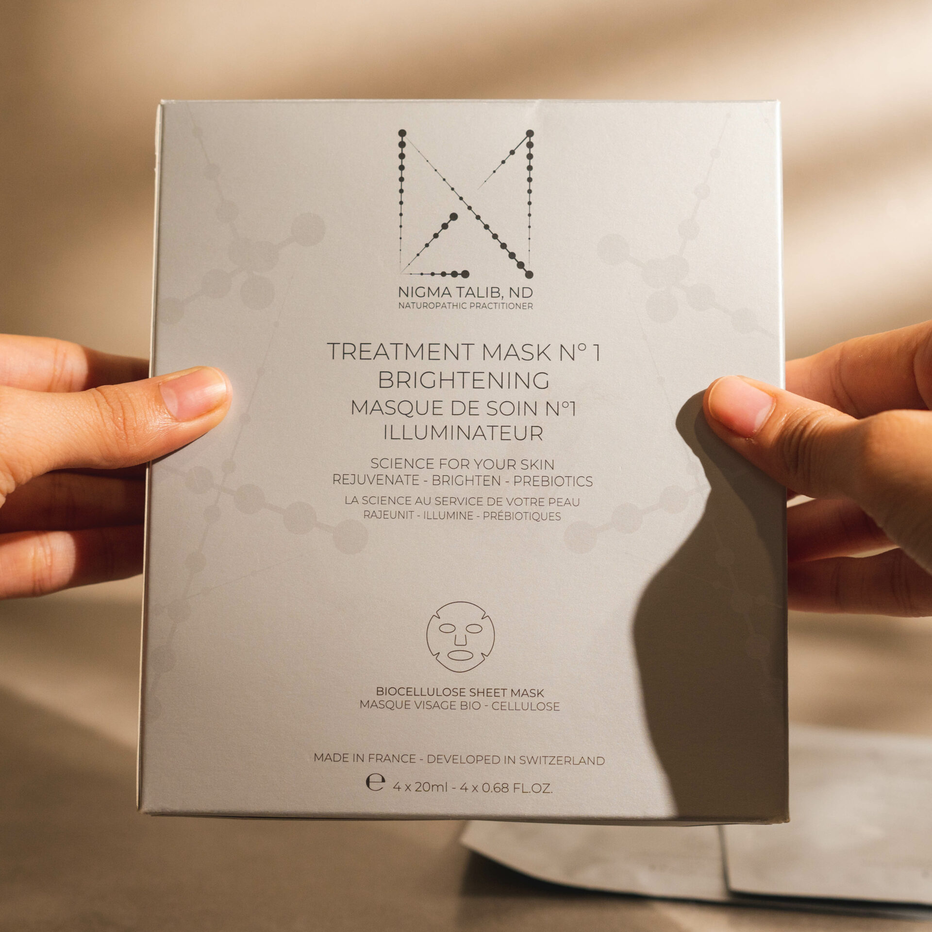 Mascarillas individuales de biocelulosa infundidas con una potente combinación de prebióticos, colágeno marino y ácido hialurónico de bajo peso molecular.