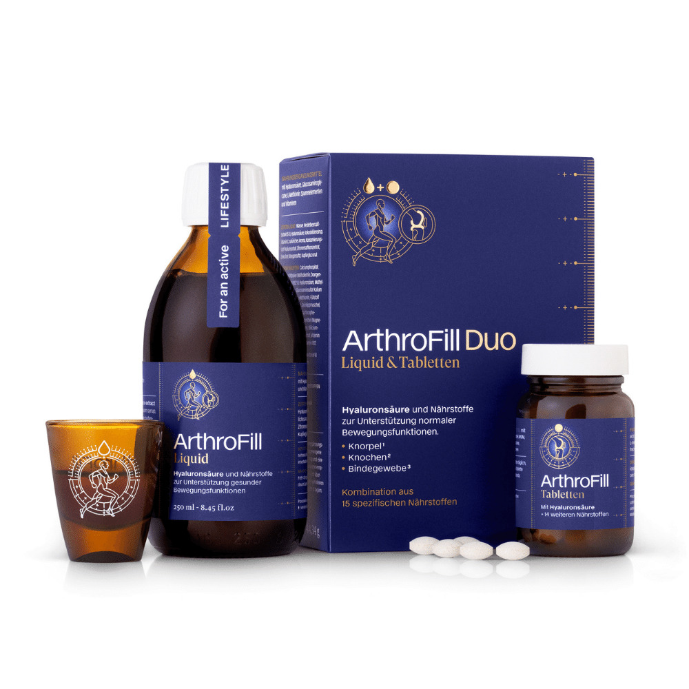 Contenido del paquete: 250 ml ArthroFill Liquid, que incluye un vaso medidor y 60 comprimidos