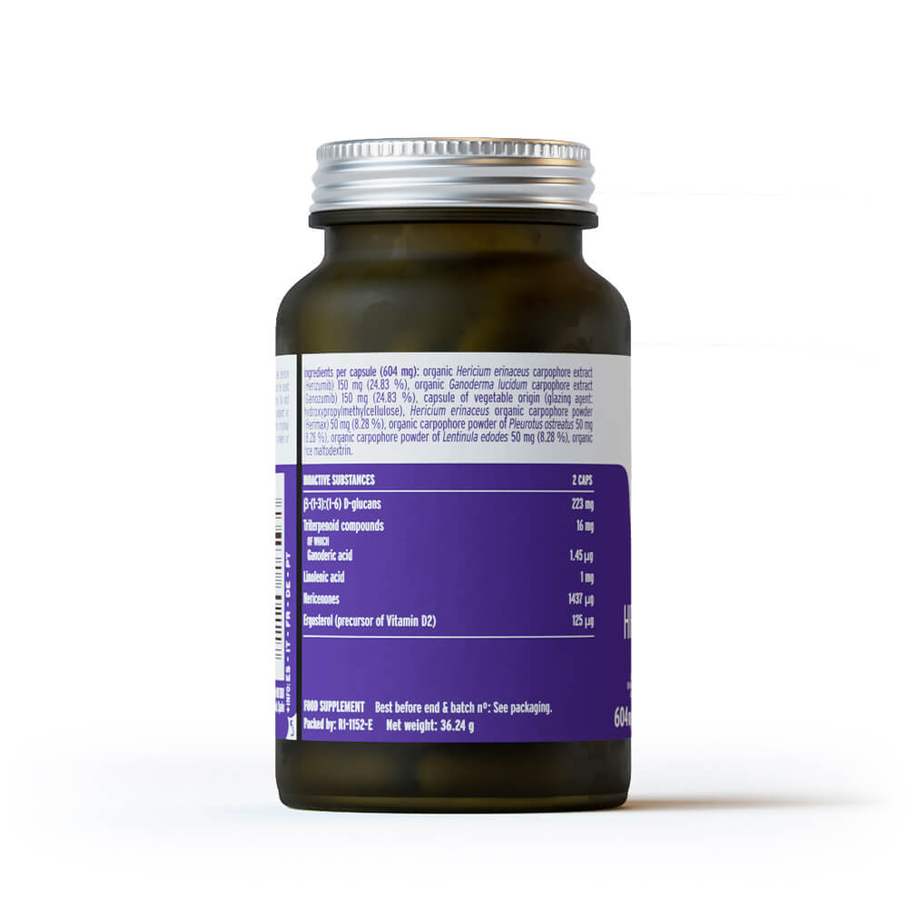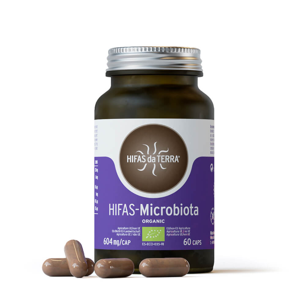 Suplemento BIO para el cuidado y equilibrio de la microbiota o flora intestinal. El producto HIFAS-Microbiota contiene las sustancias bioactivas de los hongos medicinales Reishi, Melena de león, Pleurotus y Shiitake. Entre ellas destacan ß-(1-3),(1-6) D-glucanos y α-glucanos, Triterpenoides, Ácido ganodérico, Ácido linolénico, Hericenonas y Ergosterol (precursor de Vitamina D2).