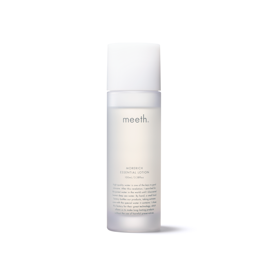 He aquí un secreto: el agua de alta calidad es una de las claves para el buen cuidado de la piel. Tras esta revelación, busqué el tipo de agua más pura del mundo hasta que descubrí el agua de mar profundo de Iwanai. Una pequeña fábrica local embotella nuestros productos manualmente, teniendo un cuidado extremo con el agua especial que contiene. Elegí esta fábrica por su gran tecnología, que nos permite elaborar productos de larga duración sin utilizar conservantes perjudiciales. Después de experimentar con diferentes fórmulas, innovamos la Morerich Essential Lotion, una loción facial que recomendamos con orgullo desde el fondo de nuestro corazón.