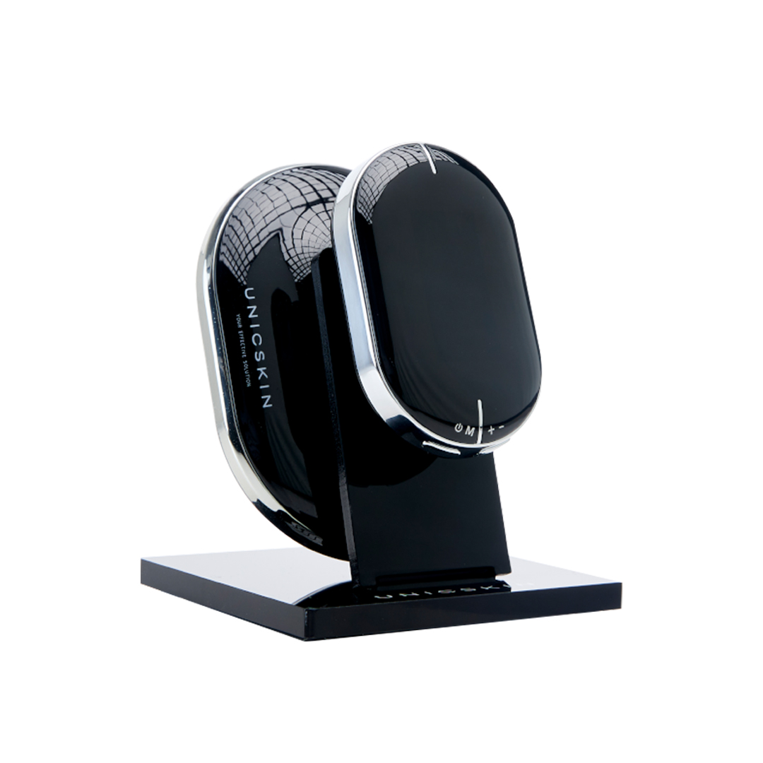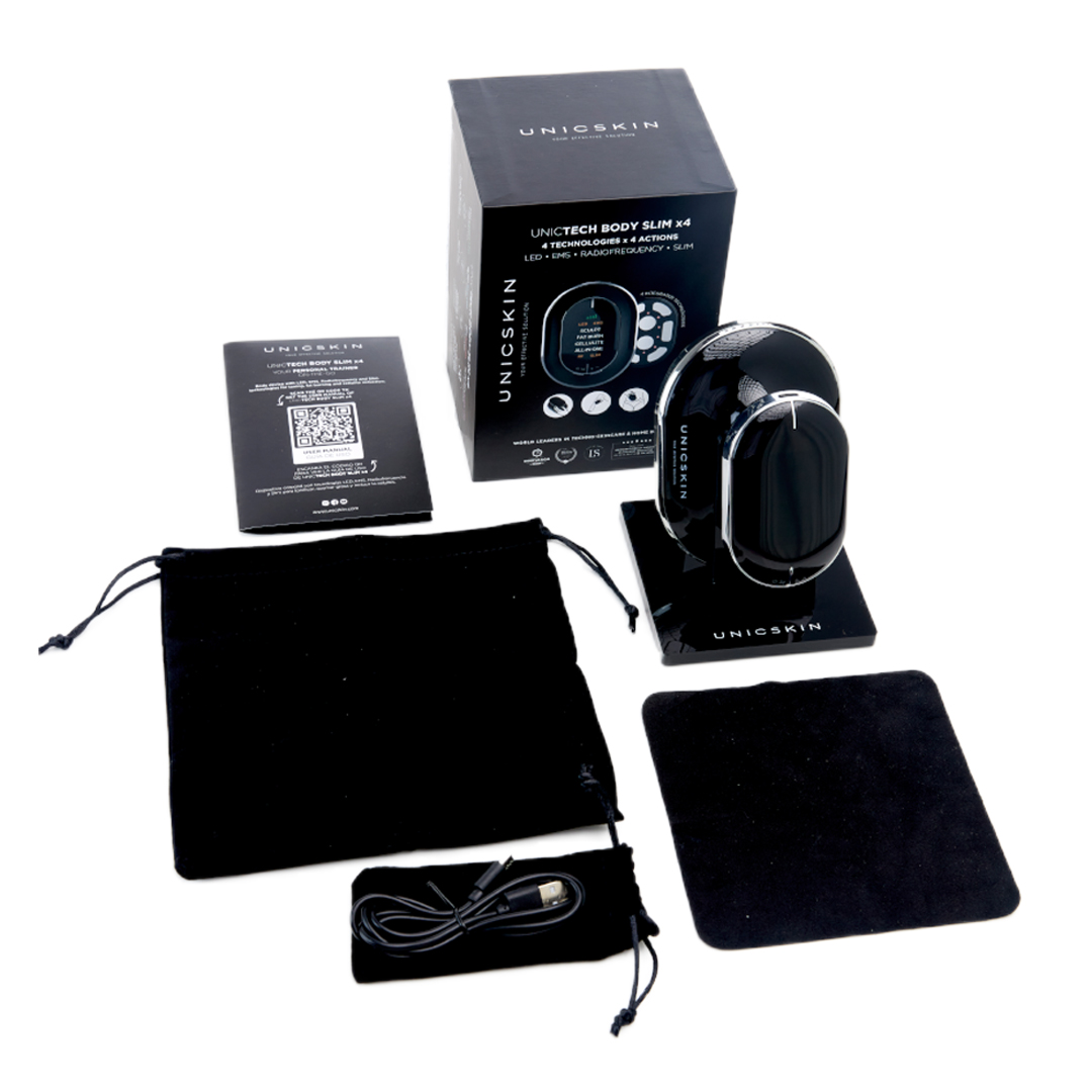 UNICTECH BODY SLIM x4 incluye: funda de terciopelo y tapa para protegerlo + pañuelo para limpiar + cable USB para cargar el dispositivo en cualquier parte + soporte para colocarlo elegantemente en el baño o en la mesilla de noche.